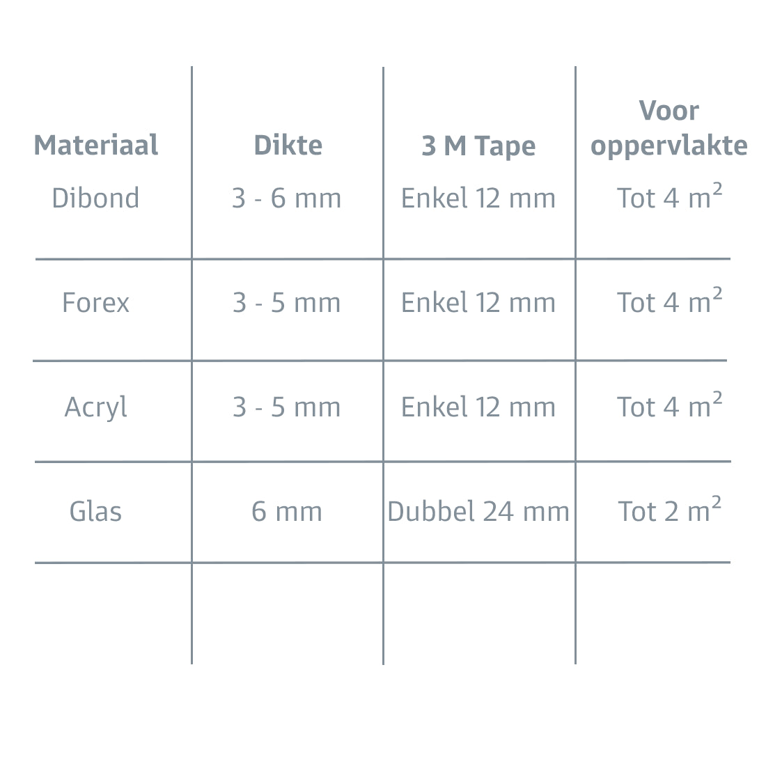 Het gebruik van de Back Frame Hanging System wordt aangeraden wanneer het te ophangen paneel binnen de gestelde afmetingen valt, zie tabel.