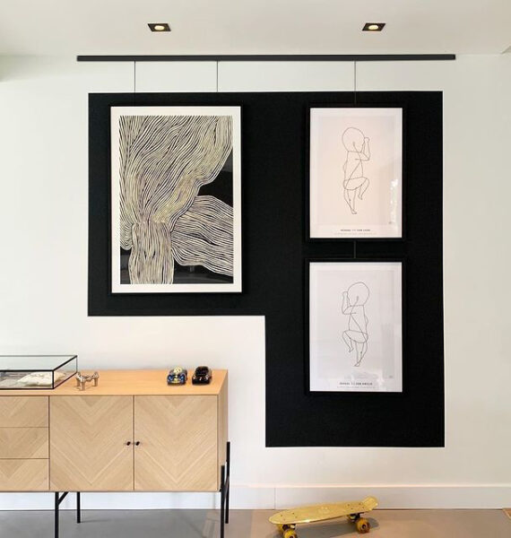 Oder doch ganz schwarz? Kombiniere das schwarze Click Rail-System und schwarze Aufhängedraht mit einer schwarzen Wand. Eine schwarze Wand im Wohnzimmer erfordert eine Portion Mut. Die Wand wird beim Betreten ins Auge fallen. Wenn du die Wand mit der richtigen Dekoration versiehst, wird sie nicht grell, dunkel oder düster wirken. Du kannst die Farbe Schwarz mit einigen subtilen und warmen Farbtönen wie Beige und Gold kombinieren. Auf diese Weise bringst du Wärme, aber auch Kontrast in deinen Raum. Diese Farbtöne kannst du zum Beispiel in den Inhalten von Rahmen verarbeiten.