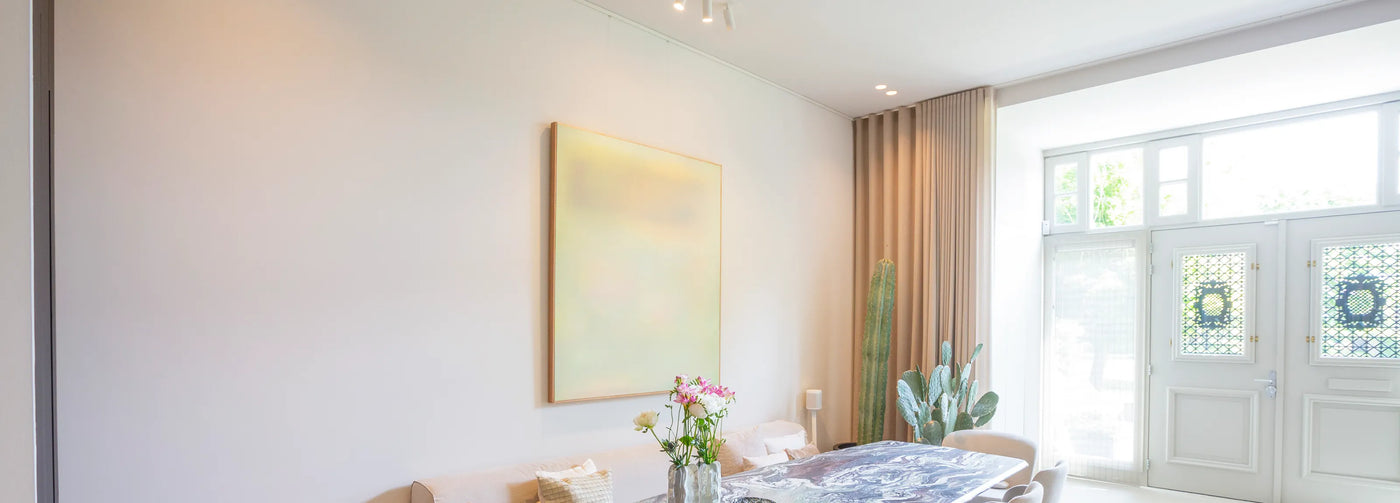 Simone chose the Click Rail Pro because it blends beautifully with the wall. “I wanted something that wouldn’t stand out,” she explains. “The bottom of the rail is almost closed, you can’t see into it. I painted the rails the same color as my walls. You don’t need connectors with this system. You can create lengths of 7 to 8 meters without visible interruptions. Visually, the system is therefore almost completely invisible.”