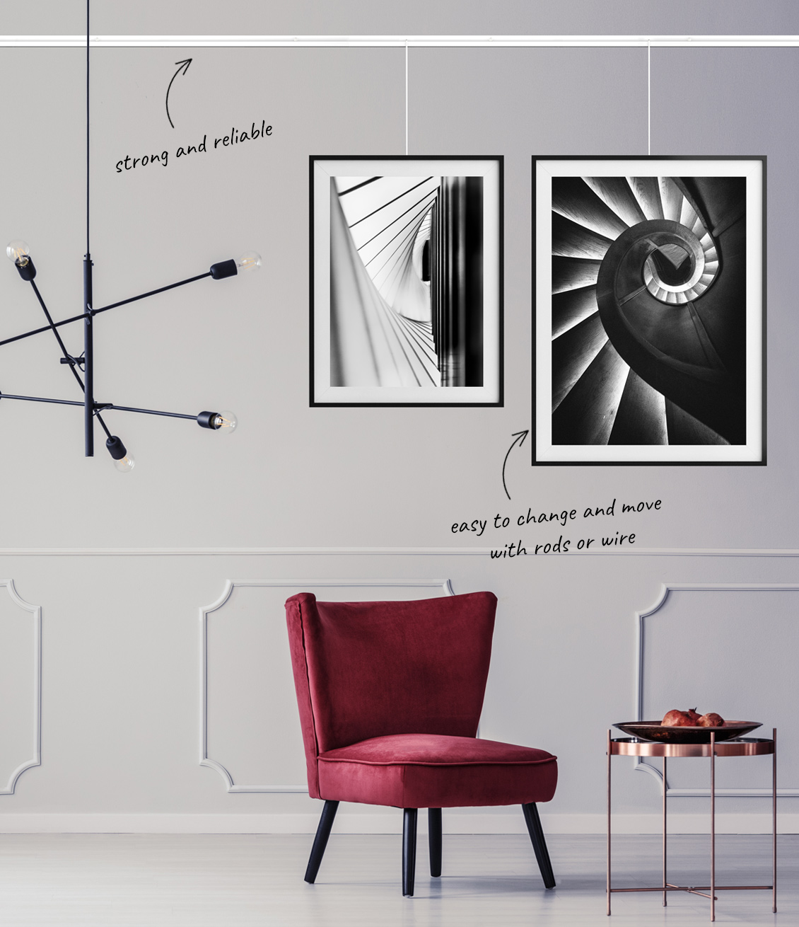 The Classic Rail is a J-shaped, open rail system (6.7 mm x 20 mm) with a modern look. This picture hanging system is available in black, white or aluminium. The rods that may be placed in the rail vary in thickness from 2 to 3 mm, and have a maximum load capacity of 20 kg. Available in white or steel, the rods use various sliding springs. Please consult the product sheet for the different options.