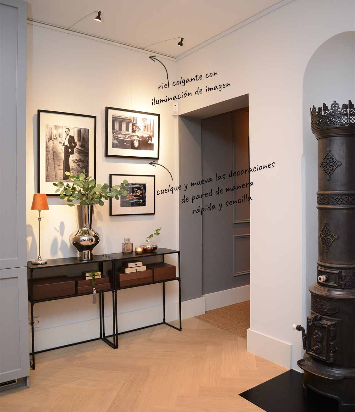 Una bonita forma de colgar e iluminar imágenesCombi Rail Pro Light es un sistema flexible para colgar imágenes que incluye iluminación. Esta guía de pared cuenta con un bello diseño neutral, por lo que resulta sencillo integrarla en cualquier habitación. Gracias a sus accesorios móviles, es posible iluminar imágenes y otros elementos decorativos con una luz óptima y de alta calidad. Además, podrá cambiar y mover fácilmente cuadros e imágenes siempre que quiera sin estropear las paredes gracias al sistema de cables y cuerdas.