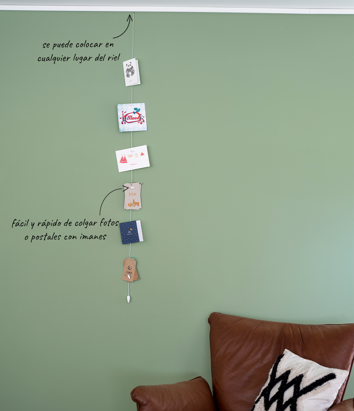Una original forma de colgar sus tarjetasPicture Mouse es un práctico y original alambre magnético colgante de 150 cm de longitud para presentar tarjetas, fotos y otros recuerdos. Es un sistema para colgar cuadros que aprovecha de forma práctica las paredes de una habitación. ¿Ya utiliza un sistema para colgar cuadros? Entonces el alambre para colgar Picture Mouse puede encajarse fácilmente en el riel Artiteq en el lugar que desee. Con los Picture Clips transparentes, pequeños imanes redondos o imanes con forma de ratón (blancos o de colores), se pueden fijar fácilmente fotos, tarjetas y otros recuerdos al cable colgante magnético de acero. Las tarjetas de Navidad, los anuncios de nacimientos o las tarjetas de cumpleaños pueden presentarse de forma original. Pero el Picture Mouse también es una alternativa práctica al marco de fotos de la pared. Se pueden presentar varias fotos una debajo de otra, lo que resulta ideal para la habitación de los niños o la cocina. El Picture Mouse está disponible en blanco o acero y mide 150 cm de largo.