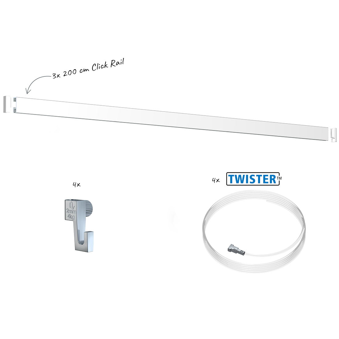 Un set completo para la máxima facilidad de uso. Este set incluye el Click Rail, los cables de suspensión Twister de perlon y el gancho Mini de 4 kg. Es ideal para colgar marcos ligeros, pósteres, cuadros y decoraciones.