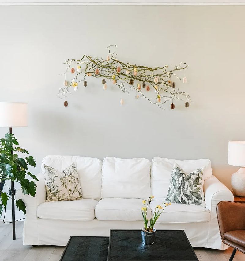L'année dernière, nous avons été surpris par une magnifique branche de Pâques au mur, accrochée avec et à notre système de suspension de tableau. Cela montre encore une fois qu'un système de suspension de tableau est bien plus que ce qu'il semble. Soyez créatif avec des branches fleuries et des branches de Pâques. Parce que quand on pense au printemps, on pense aussi à Pâques !