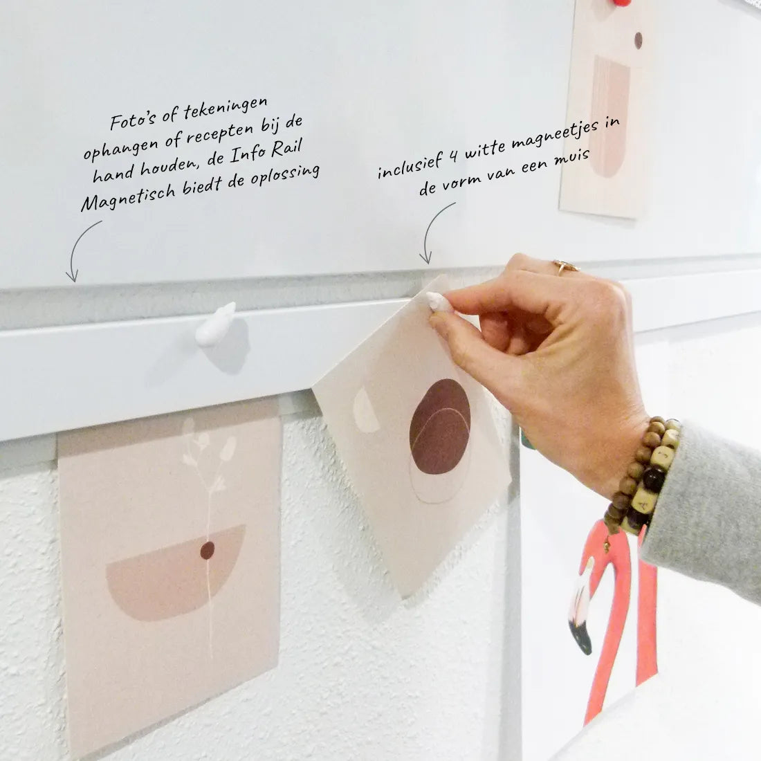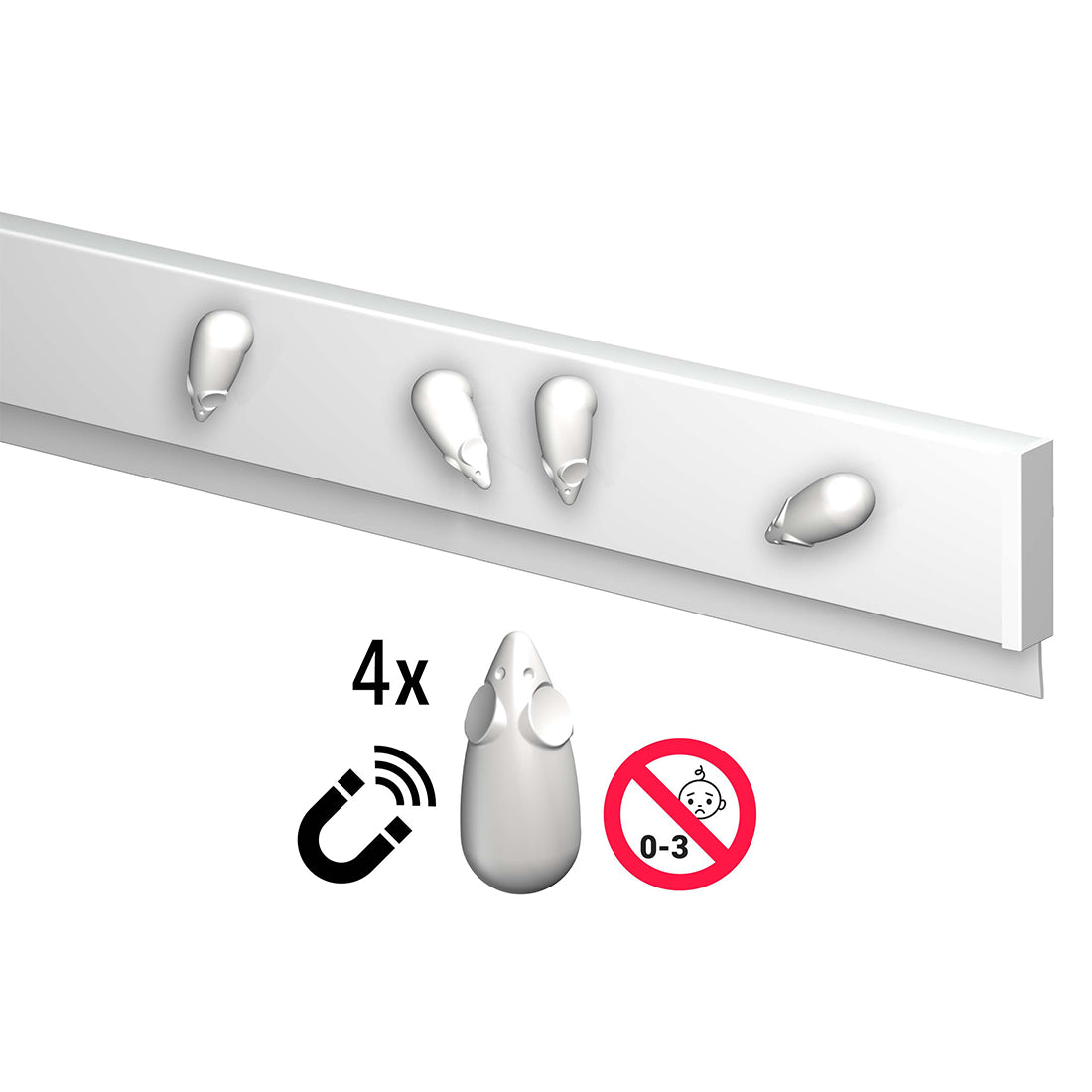 L'Info Rail Magnétique est conçu pour suspendre des documents grâce à un triple serrage en caoutchouc dans le rail et pourvu d'une bande magnétique pratique sur le devant. Ce rail peut ainsi tenir fermement le papier à partir de 80 g jusqu'au carton de 2 mm d'épaisseur. Le tout est complété pour l'utilisation de la partie magnétique de 4 petits aimants blancs en forme de souris. Les dessins ou les photos s'accrochent ainsi facilement et joliment à l'avant du rail grâce à ces petits aimants.