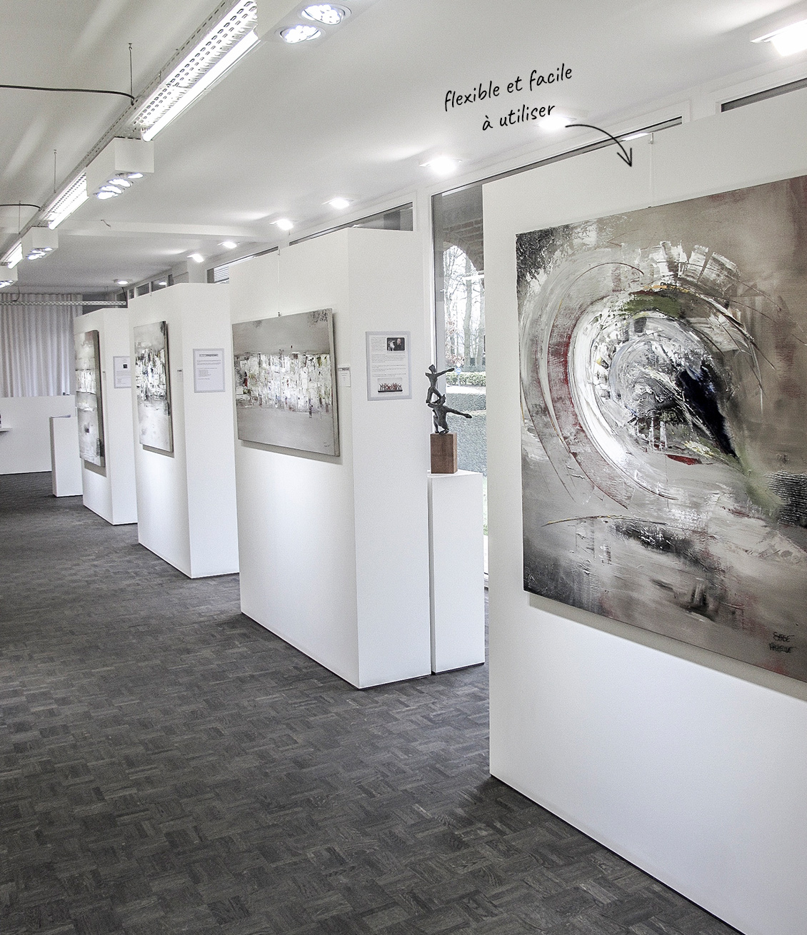 Suspension de cadres et tableaux sur des parois de séparationIl n’est pas toujours possible ou permis d’installer des cimaises pour tableaux. Nous proposons donc également des solutions pour la suspension de tableaux et de décorations murales sous la forme de crochets pour parois de séparation. Nous disposons d’une gamme de crochets pour les pièces où des parois de séparation sont utilisées. Cela permet de suspendre de manière sûre et pratique des tableaux et décorations sur ce type de murs. Les crochets pour parois de séparation sont placés sur la bordure supérieure de la paroi, puis utilisés avec une corde (en perlon) avec un crochet pour tableaux.