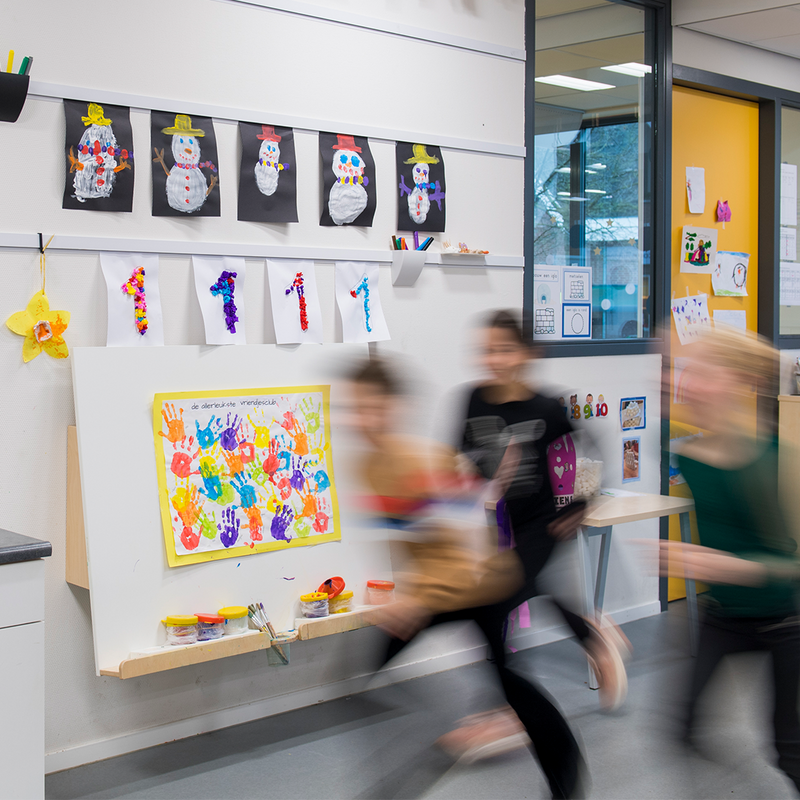 - Klaslokalen (onder- en bovenbouw): tekeningen van leerlingen, thema-hoeken en leerkaarten.